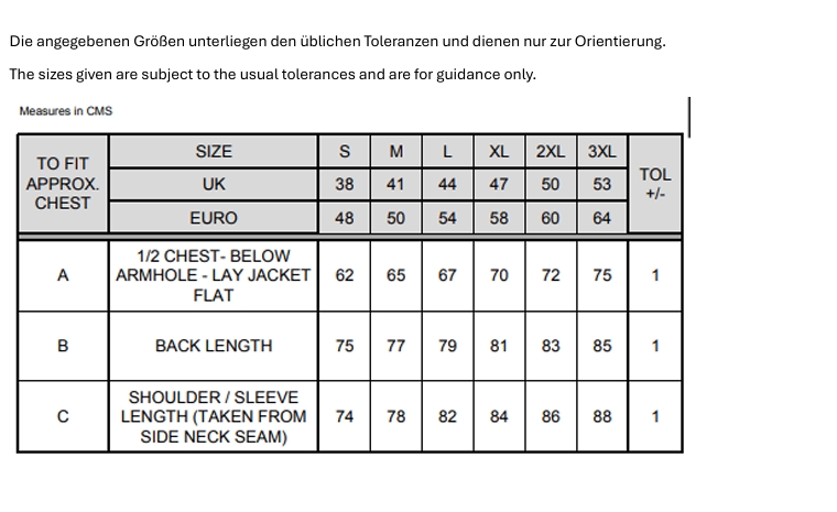 | Size | 48 | 50 | 54 | 58 | 60 | 64 |