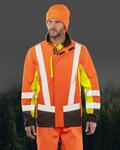 Heavy duty recycled zip through stand-up collar with chin guard and zip pull, Elastane-free, crimped yarn stretch, easy to print, Microfleece-lined for extra warmth, Zipped front & chest pockets, Dark panels to mask grime, Printed safety bands, Shaped longer back, Tear release cuff, Hang loop, Outer storm flap, Recycled fabric using materials made from recycled plastic bottles and post-industrial wasteRecyclable cartons and biodegradable bags, end of life recyclable