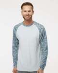 Paragon Adult Panama Sleeve Print Water Pattern Raglan T-shirt. An island-themed twist on the classic color block long sleeved tee. Panama features our open water pattern sublimated on the sleeves and neck leaving a solid color body, perfect for additional printed decoration.  The 93% Microfiber Polyester/7% Spandex fabric provides comfort stretch, moisture wicking and anti-microbial capabilities, as well as UPF50+ sun protection.  Other features include ParagonXP tear away label, hemmed sleeves and bottom.  4.4 oz